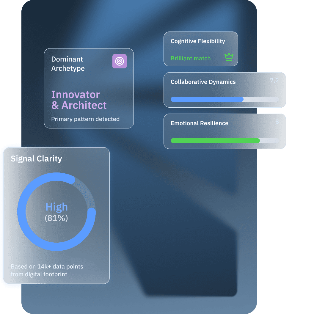 You receive a structured behavioural profile within minutes, built using a research-informed methodology, translating your input and digital footprint into behavioural signals that highlight dominant patterns in how you approach problems, decisions, and interaction.